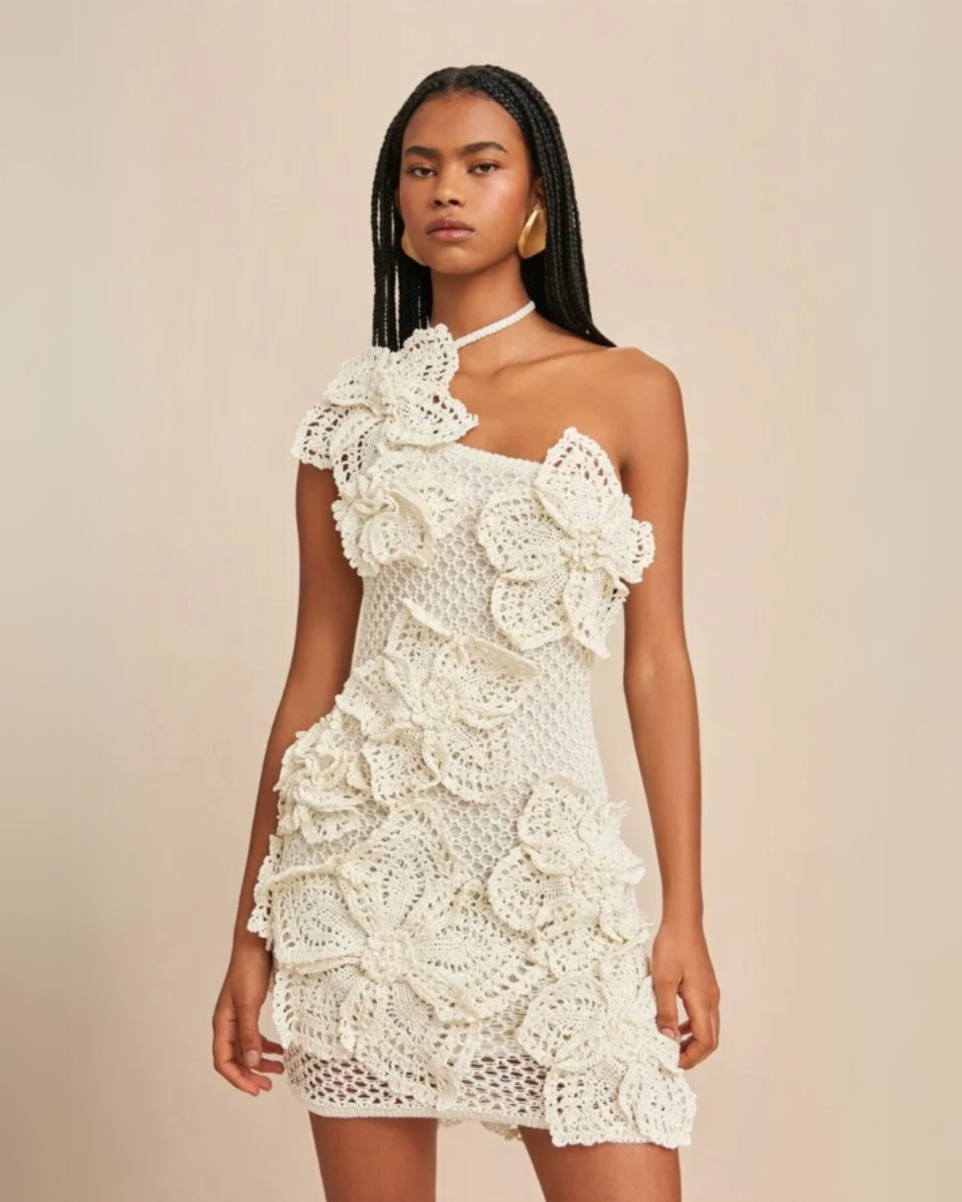 Unleash your flair for texture and artistry in the Claribel Bloomweave Petal Dress — a captivating mini that fuses craftsmanship with bold design. With sculpted floral crochet and a confident one-shoulder neckline, this piece offers an unforgettable blend of movement and detail. Perfect for garden events or sundown soirées, it brings dimensional charm with every step.
