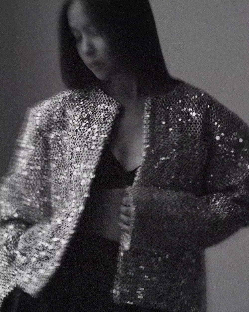 Grijze paillettenblazer - sprankelend satijnen feestjasje